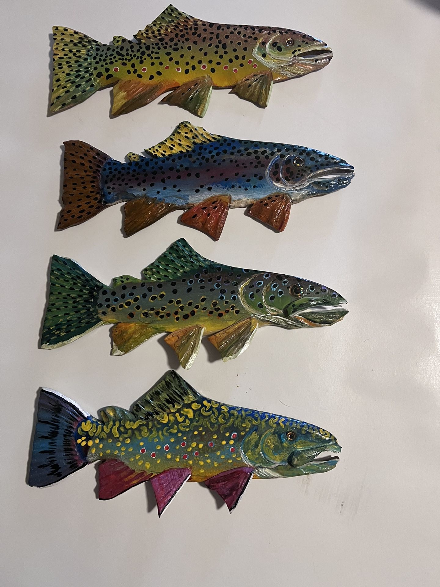Most sought after trout in North America. The Rainbow, Brown, Cutthroat, and Brook trout. 4 ways to order on request; 1) Can be Left or Right Face. 2) Can have magnets on the back for fridge or?? 3) Hangers on back for installation. 4) Strung like a stringer of fish. Handmade and signed by Idaho artist. 3 dimensional carvings with exceptional details. Oil painted and made from restorative wood. Over 5770 carvings sold nationwide since 2008. Carvings are never duplicated, maybe similar but each set is original.