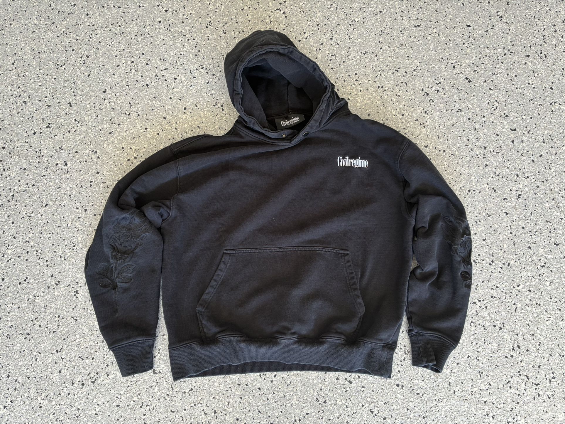 “CIVIL REGIME” Rare Black Rose Black Hoodie. Size Large. Pockets. Pre Owned.