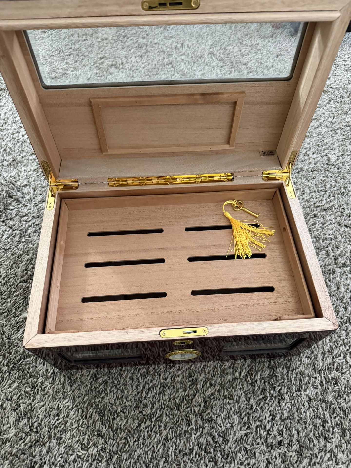 Quality Importers Milano Glasstop desktop humidor in rosewood/mahogany finish. This is the larger Milano model — holds 75 to 100 cigars depending on size. Features: ∙ Single tempered beveled glass top panel for easy viewing ∙ Spanish cedar interior lining with cedar tray and dividers ∙ Front-mounted analog hygrometer with brass frame ∙ Gold-plated lock and key with tassel (included) ∙ Gold-plated hidden quadrant hinges ∙ SureSeal technology for a tight lid closure ∙ Felt-lined scratch-resistant bottom