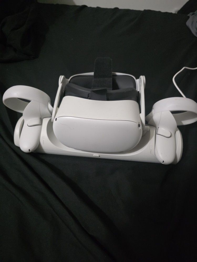 Used, no damdage Upgraded headstrap Controllers have rechargable batteries Charging dock has light you can turn on/off Price negotiable