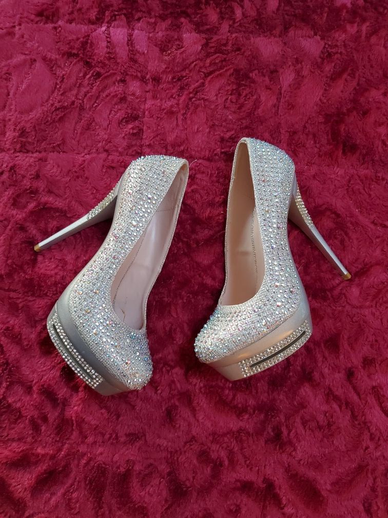 These preloved stilettos are in like new condition! They feature gorgeous crystals rhinestones over a silver backing with cutouts on the bottom surrounded by more rhinestones!! They have rubber soles for better traction! SIZE 6.5