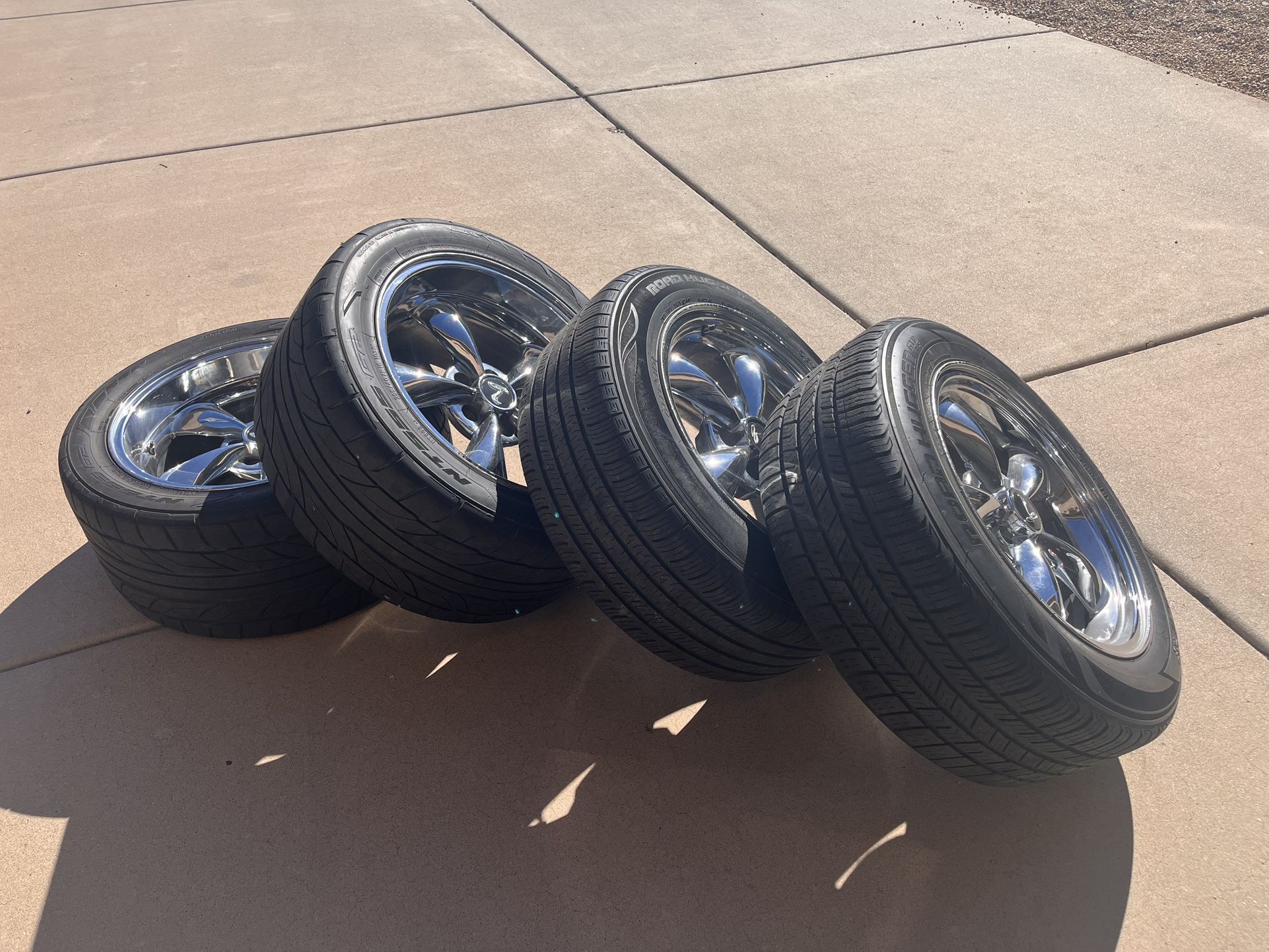 Rears are 295/40 7R18 10300 tire size Fronts are 235/55 RI7 99H7 tire size 5x114.3 bolt pattern — fits 2005–2014 Mustangs and other 5x114.3 vehicles Wheels are not perfect but still look amazing TIRES WILL NEED TO BE REPLACED