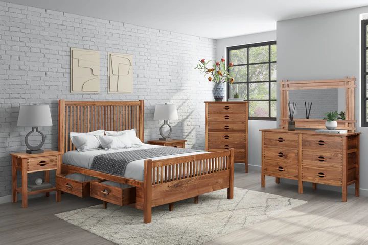 Elevate your bedroom with the Urban Mission Bedroom Set, a timeless collection crafted from premium solid black walnut. With its clean lines, dovetail joinery, and minimalist design, this set effortlessly blends the natural beauty of walnut with modern functionality. The warm tones and striking grain patterns of black walnut ensure every piece is as unique as it is elegant, making this collection a sophisticated choice for any space. Available to add are; Storage Bed, Dresser, Mirror, Nightstands, and Chest, offering ample storage and cohesive style to transform your bedroom into a serene retreat. Urban Mission Storage Bed The centerpiece of the collection, the Urban Mission Storage Bed, combines practicality with modern style. Crafted from solid black walnut, this platform bed eliminates the need for a box spring while providing exceptional storage with four smooth-gliding under-bed drawers, perfect for keeping extra linens, clothing, or seasonal items organized. Its slatted headboard and clean design make it an ideal fit for a variety of decor styles. Key Features: Solid black walnut frame with a rich, hand-applied finish. Platform design eliminates the need for a box spring. Four smooth-glide storage drawers with ball-bearing guides for easy access.