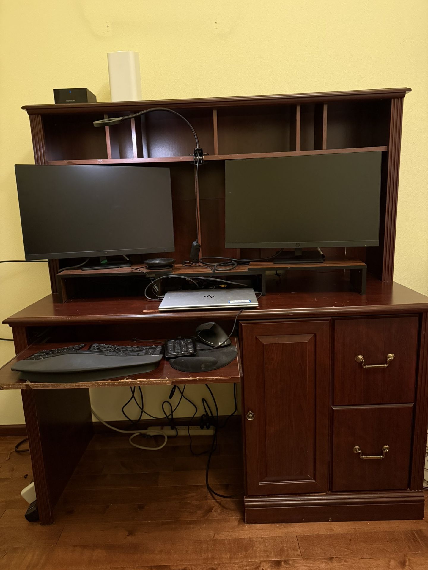 Cherry desk with hitch features to long file cabinet drawers and one closed tall cabinet. Six cubbies in the no -detachable hutch. Keyboard tray rolls out. Dimensions: 55” long by 57” tall and 23” wide.