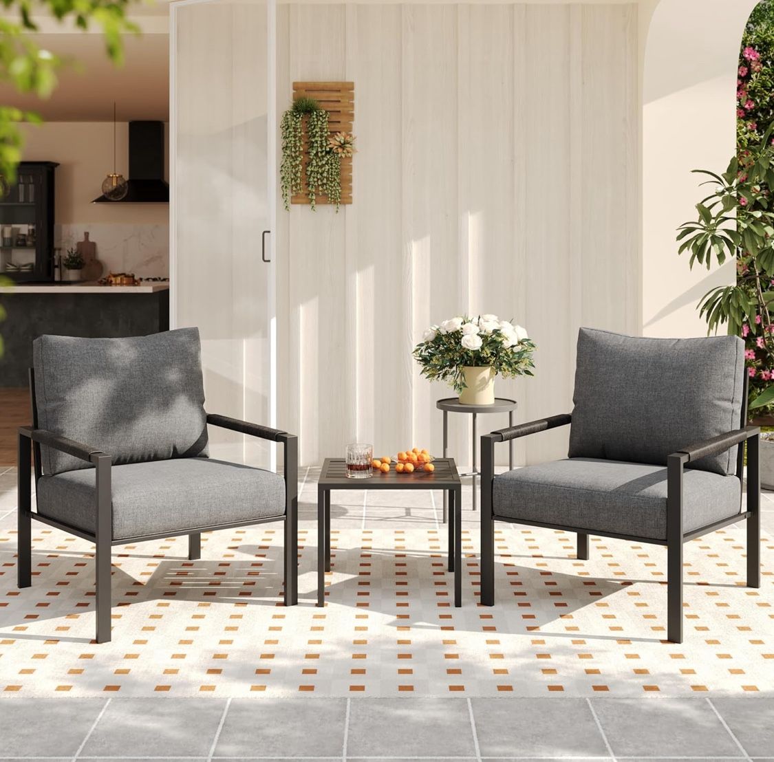 3 Pieces Rattan Outdoor Furniture Set, All-Weather Patio Conversation Set with Dark Grey Cushions and Coffee Table for Garden, Backyard, Balcony, Poolside