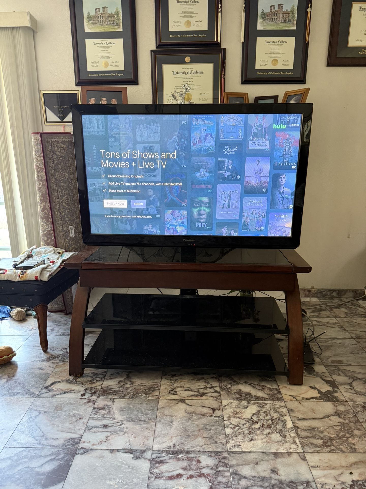 TV - Panasonic 55 inch 720p Tv Stand with shelves + drawer + swivel mount for TV Must buy as bundle. Must be able to lift it into your Truck/Van yourself Message if you have any questions.