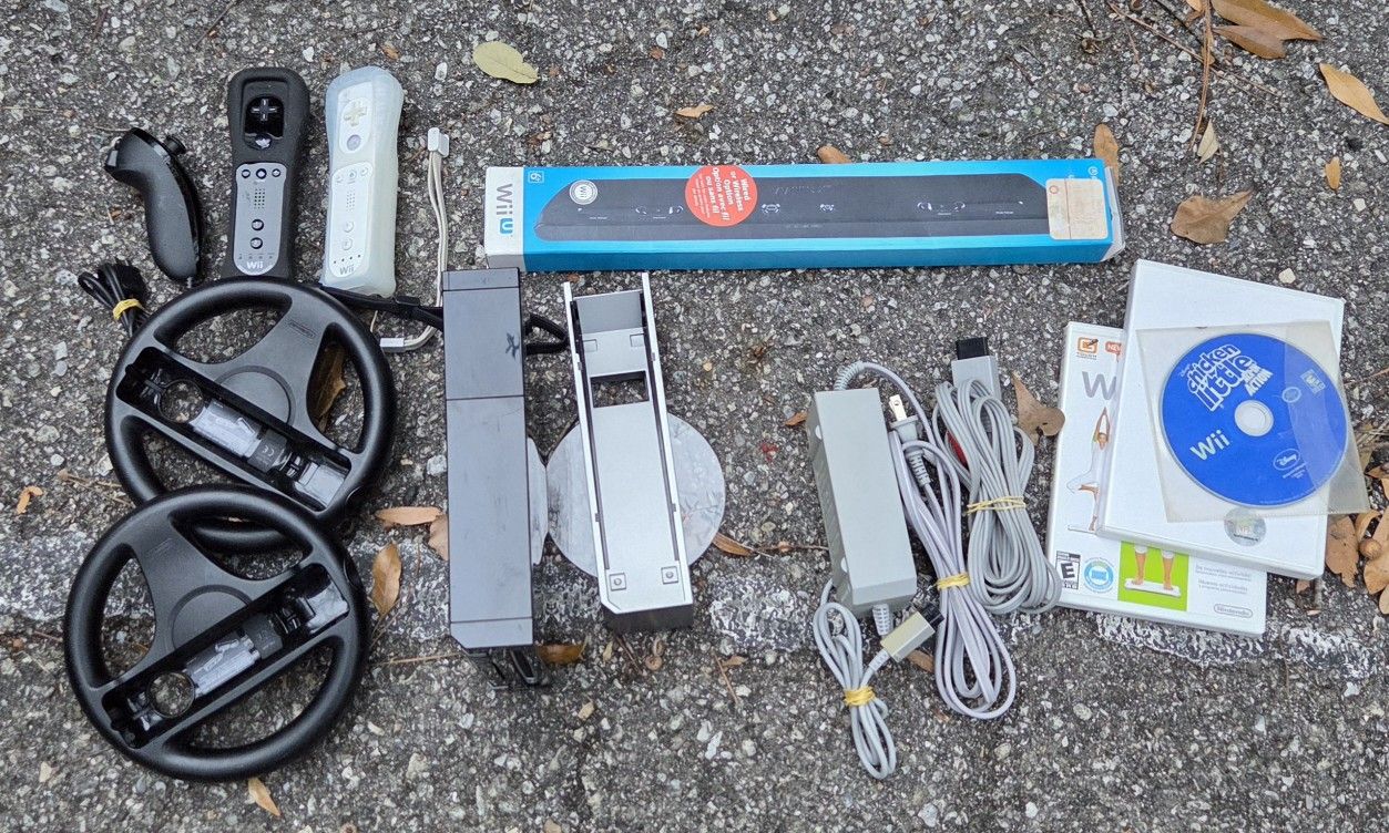 Nintendo Wii console. OEM A/V cable. OEM Power cable. Wii U ultra sensor bar that is new and works with all wii. OEM Console stand. OEM Black wii motion plus remote. OEM White wii remote. OEM Black nunchuk. OEM Black & clear silicone remote covers. Wii Sports. Wii fit plus. Chicken Little Ace in action. 2 Nintendo Wii controller wheels. Cash, venmo, or cash app. Meet in Leland, Wilmington, or Bolton.
