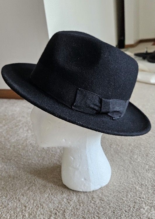 Pre-owned VINTAGE WOMEN'S 100% WOOL WATERPROOF GARMENT COMPANY FEDORA WITH BOW. Used once for ComicCon cosplay. In very good condition. Black. Size L. 11.75"W x 12.75"D (front to back) x ~5"H. $15, OBO. Cash only.