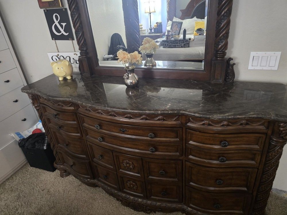 Complete Bedroom Set Includes: Bed, Dresser with Mirror, and Two Nightstands Stylish, functional, and perfect for any bedroom!