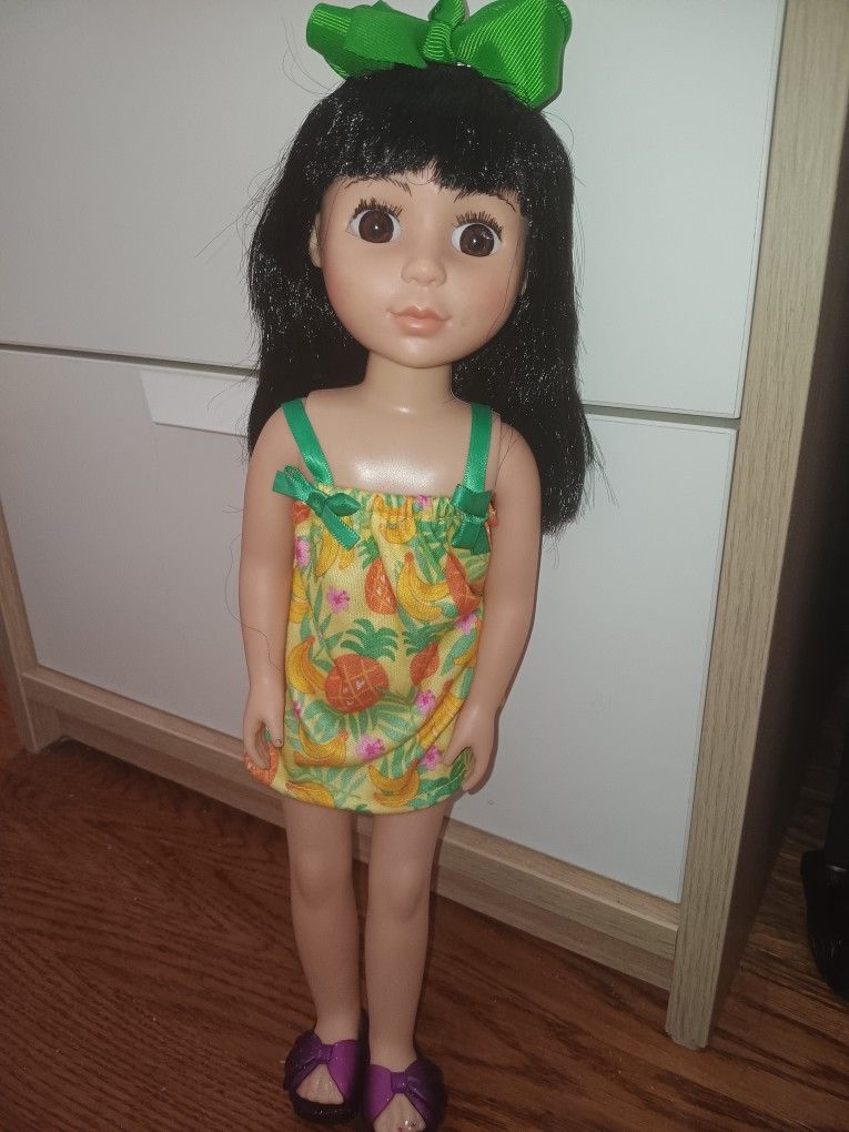 14 inch doll includes hat, 7 different outfits and dresses, 2 pair of shoes and boots, glasses, hangers.