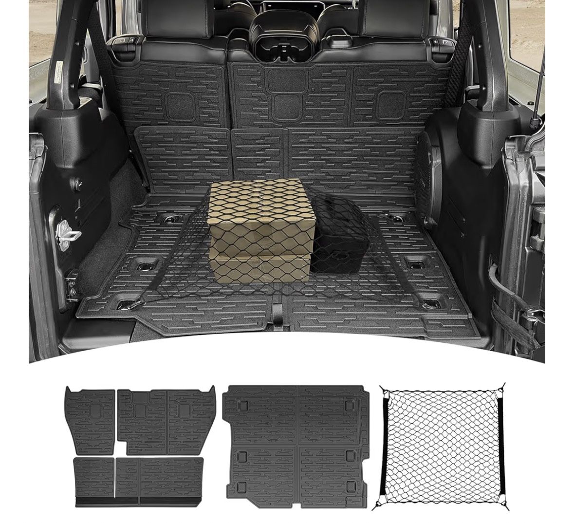 Cargo Mats with Net for 2018-2025 Jeep Wrangler JL Unlimited 4X4 Accessories All Weather Protection Rear Seat Back Cover Trunk Liner Cargo Net for 18-25 JL JLU Gas Type 4 Door(Not for 4XE)