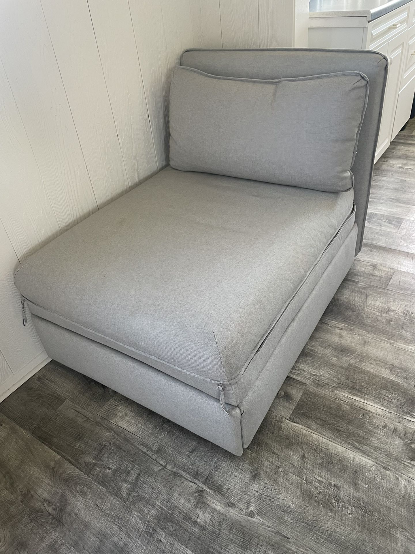 Ikea Vallentuna Sleeper sofa with backrests Super comfortable for sleeping Width: 44 1/2 " Depth: 36 5/8 " Height: 33 1/8 " Seat height: 17 3/4 " Bed width: 31 1/2 " Bed length: 78 3/4 " Frame for sleeper module Smolder resistant lining/ Lining/ Smolder resistant lining: Polyester wadding Frame: Solid wood, Plywood, Particleboard, Polyurethane foam 2.0 lb/cu.ft. Seat cushion: Polyurethane foam 2.0 lb/cu.ft., High-resilience polyurethane foam (cold foam) 2.2 lb/cu.ft., Non-woven polypropylene, Felt liner Castor/ Leg/ Sleeve: Polypropylene Pocket spring unit: Steel Bed slat: Plywood Backrest frame Smolder resistant lining: Polyester wadding Frame: Solid wood, Plywood, Fiberboard, Polyurethane foam 2.0 lb/cu.ft., Polyester wadding, Particleboard Back inner cushion Smolder resistant lining: Polyester wadding Cushion: Polyester wadding, Polyester fiber balls Cover for back cushion/ cover for backrest 100 % polyester (100% recycled) Cover for sleeper module Quilting: Polyester wadding Cover, other surfaces: Non-woven polypropylene Fabric: 100 % polyester (100% recycled) Removable cover Cover for back cushion/cover for backrest/cover for sleeper module Machine wash warm, normal cycle. To be washed separately. Do not bleach. Do not tumble dry. Iron medium temperature, max 300°F/150°C. Dry clean any solvent except trichloroethylene.