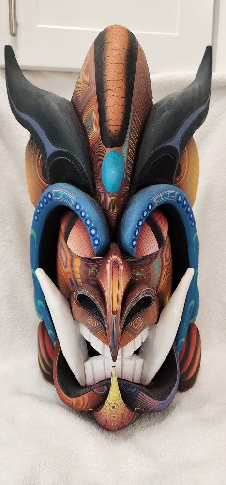 This is a Boruca mask - hand carved indigenous art from Costa Rica. About 2 years ago I brought these back on the plane with me from Costa Rica. It took me a few hours to pick these as I thought they were the most beautiful ones. We're in the process of moving to Costa Rica and I will not be bringing these with me. There in great shape. Measurements are 24in tall by 13in wide.
