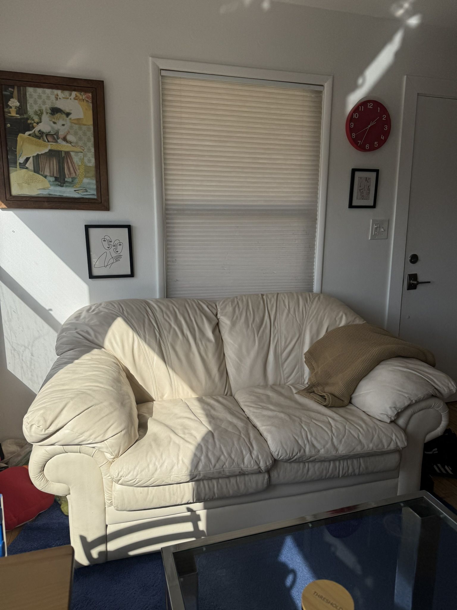 White leather love seat couch in gently used condition. Pickup in echo park. Length 5’6 x height 2’9x width 3’4. Perfect for a small apartment