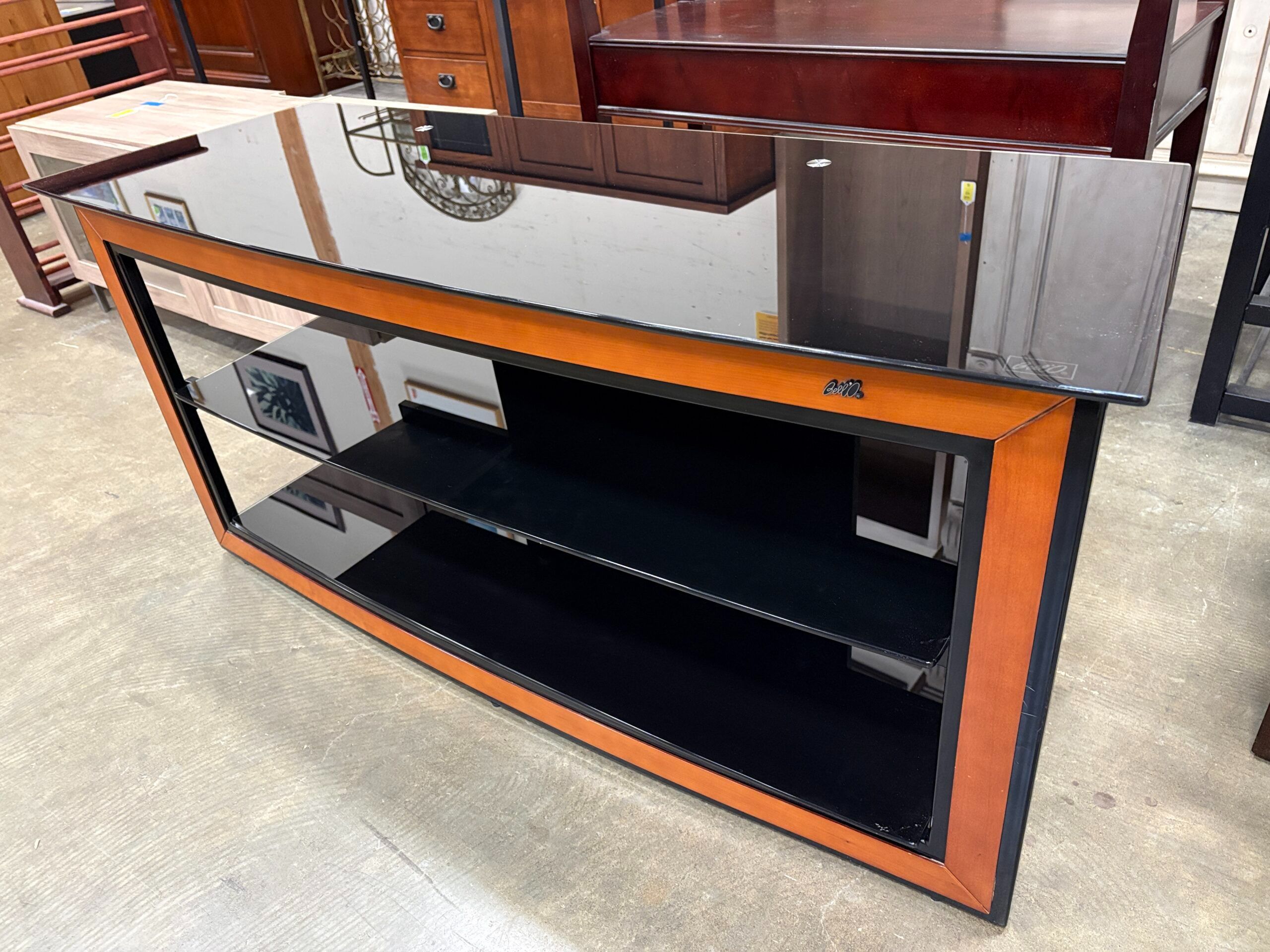 BELLO 3 Tier Tempered Black Glass Media Stand with Cherry Finished Wood Trim
