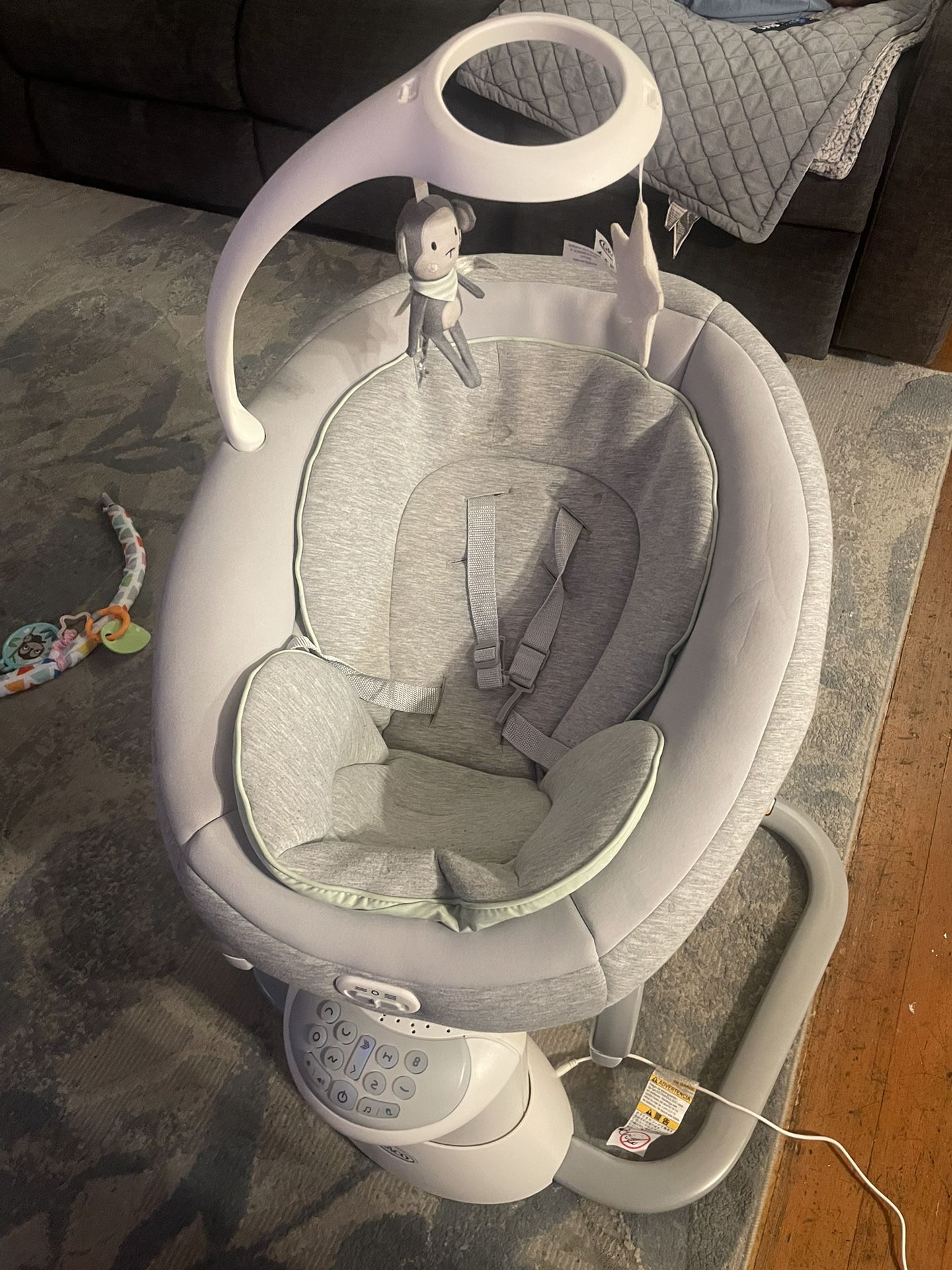 Swing with removable rocker. Features 15 songs plus 2 vibrating speeds and 8 soothing motions in 2 directions