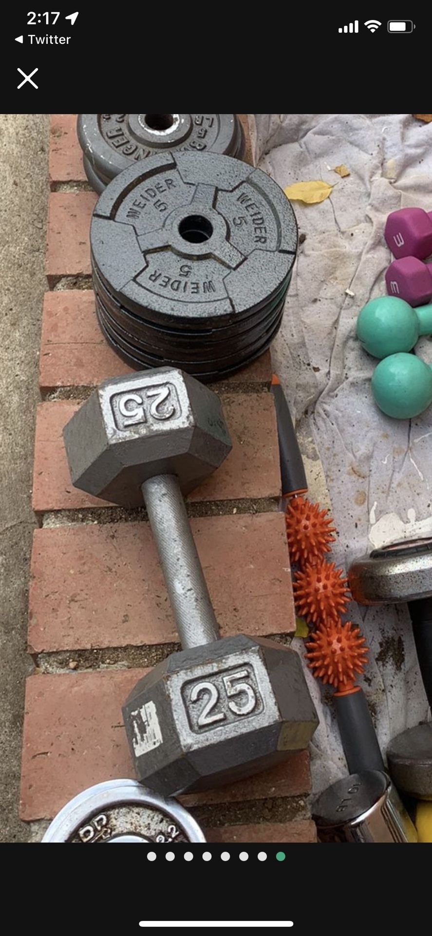 Don’t be the dumbass who says so everything for $20…. $20 for the 25lb dumbell in the first picture $50 for the curl bar with 6 5s in great shape Also have a few more fives and adjustable 5 lb twist on dumbbells with locks Need to make space Have all sorts of other stuff too…