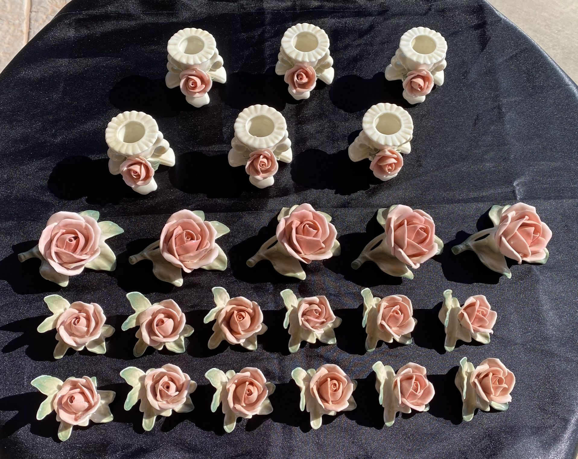 Vintage Dresden porcelain with rose theme, would make excellent wedding decor for reception tables. Large lot includes six small candle holders, five large roses, 12 small roses, one large swan, two medium swans, one small swan (only piece that is unmarked underneath), two large candle holders, five small dishes, and an adorable salt and pepper shaker set marked England that matches perfectly. All pieces are in great condition, markings shown in photos. For a small investment, decorate your event then keep the pieces as heirlooms! See a piece you love but don’t want the whole lot? Reach out. Willing to split the listing. Pick up in San Marcos. Check out my other posts for more antique decor!