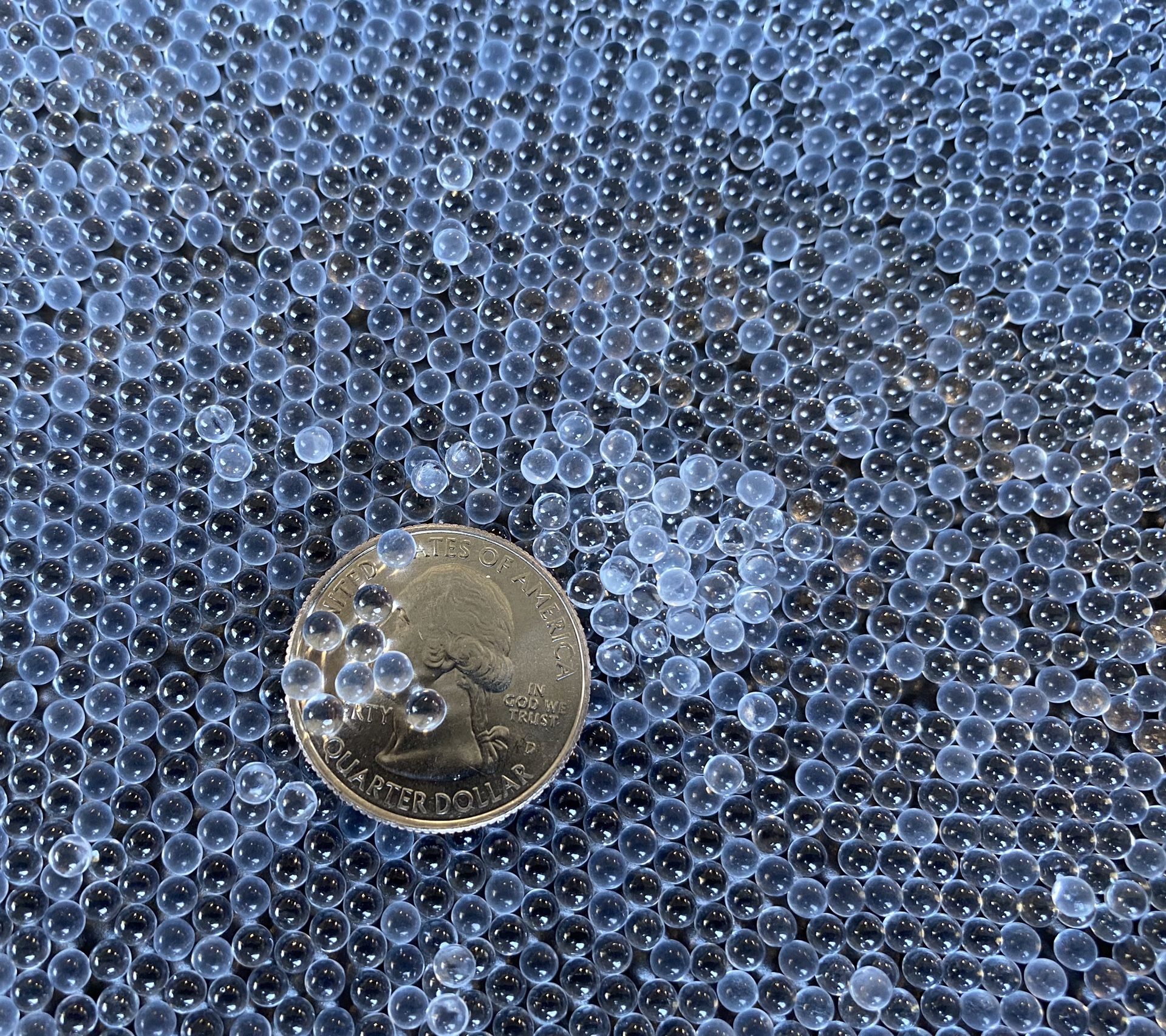Unused,NOS. clear, solid glass micro-marbles. Uniform in size and roundness. Can be used for laboratory work, sanitizing, arts & crafts projects, bead blasting, or for vase fillers and makeup brush holders! Bead sizes: 3mm and 1.5mm Color: clear (no-hole) Material: Solid Soda Lime glass 50-lb. sealed buckets of new old stock. Limited supply.