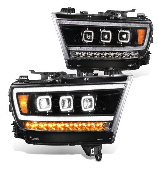 Black Amber Headlights LED DRL Compatible with 19-24 Ram 1500 Big Horn, Laramie, Laramie Longhorn, Limited, Lone Star, Rebel, Tradesman, TRX; w/ OEM Halogen Headlights Se Habla Español