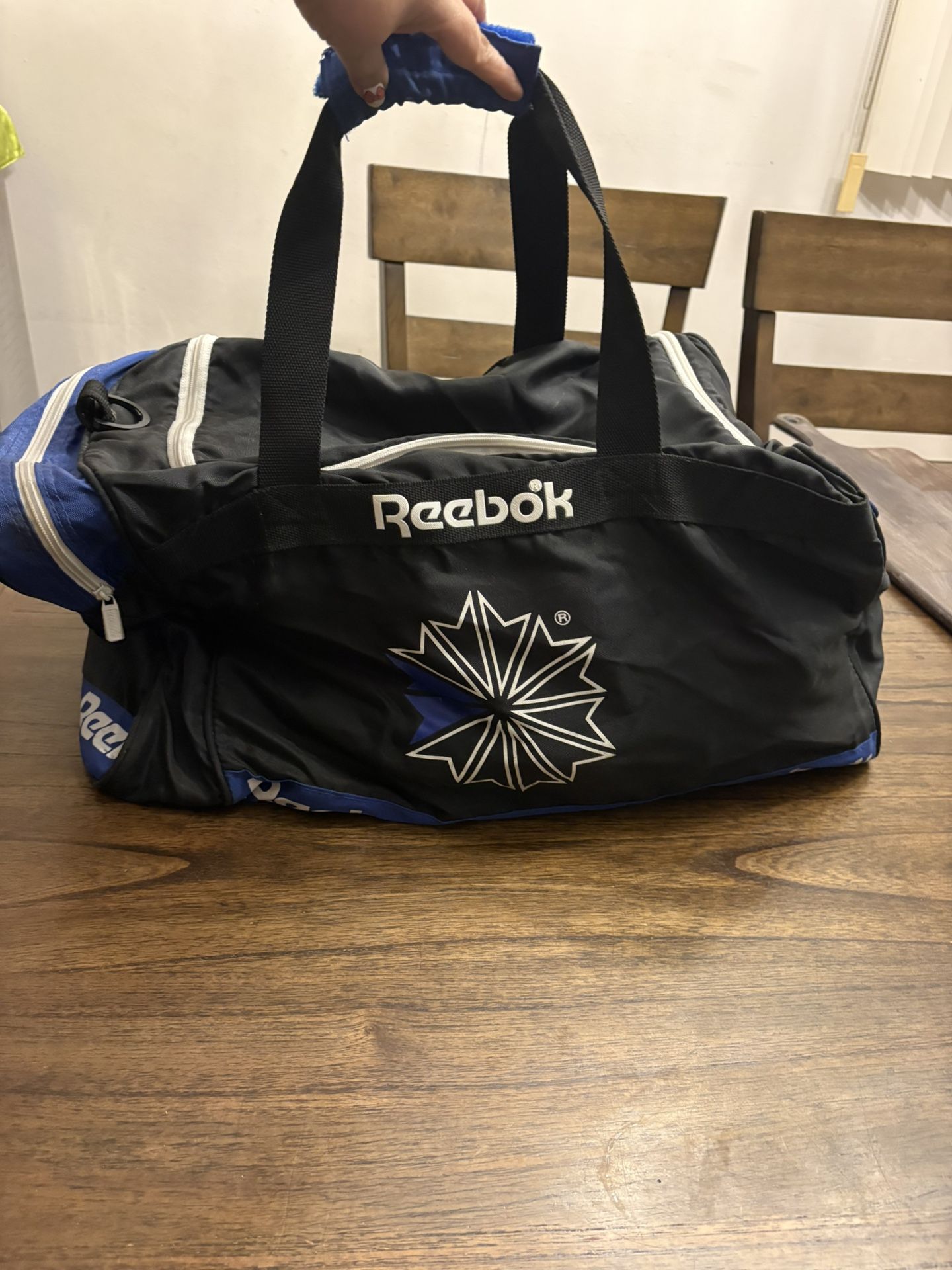 Reebok blue duffle bag Appx 11” tall and 24” long Side compartment and large inside compartment Great as a gym bag, sports bag, overnight bag