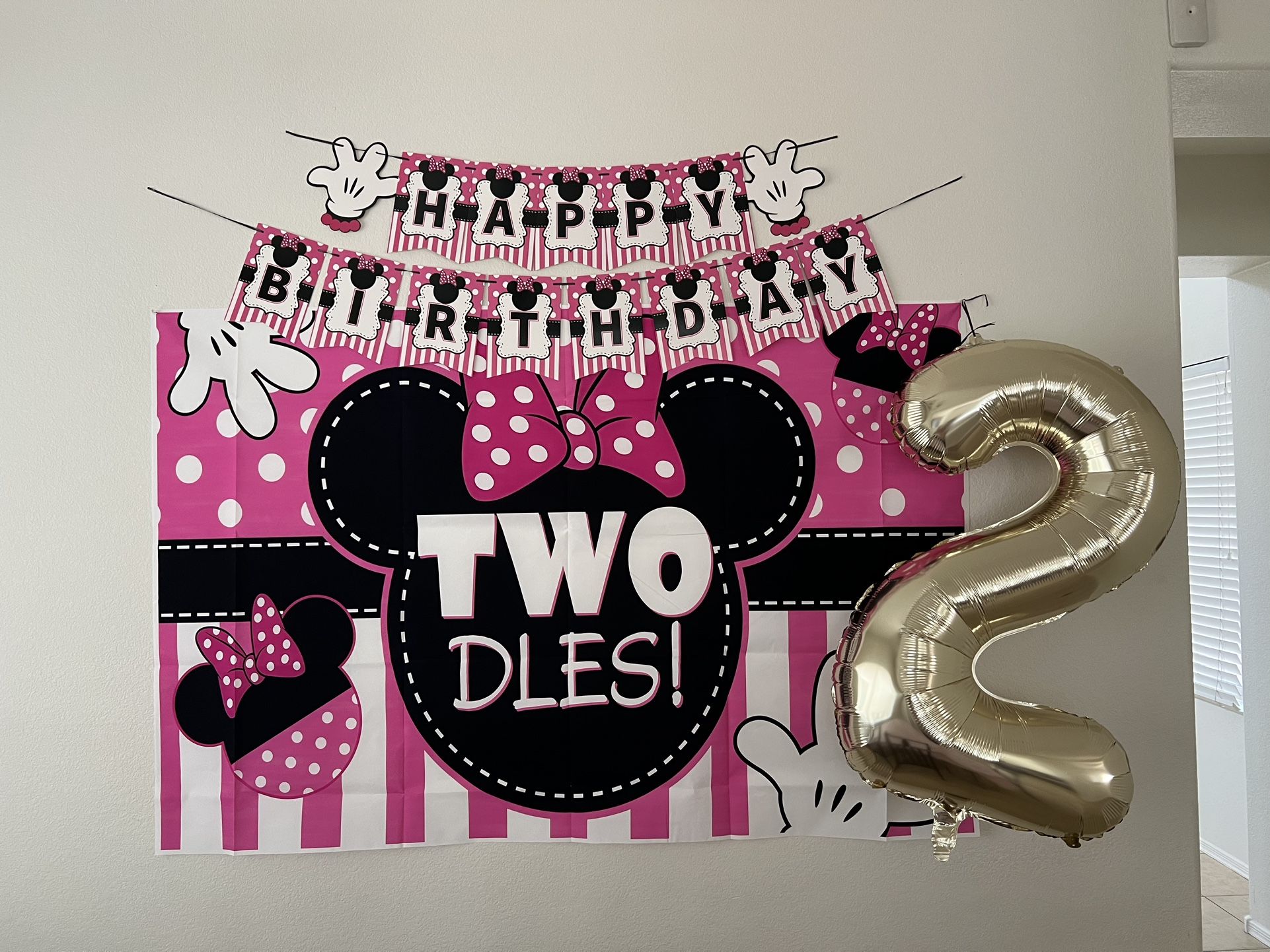 Minnie Twodles Birthday Banner, balloons (not the “2” pictured) cupcake toppers, cake topper.