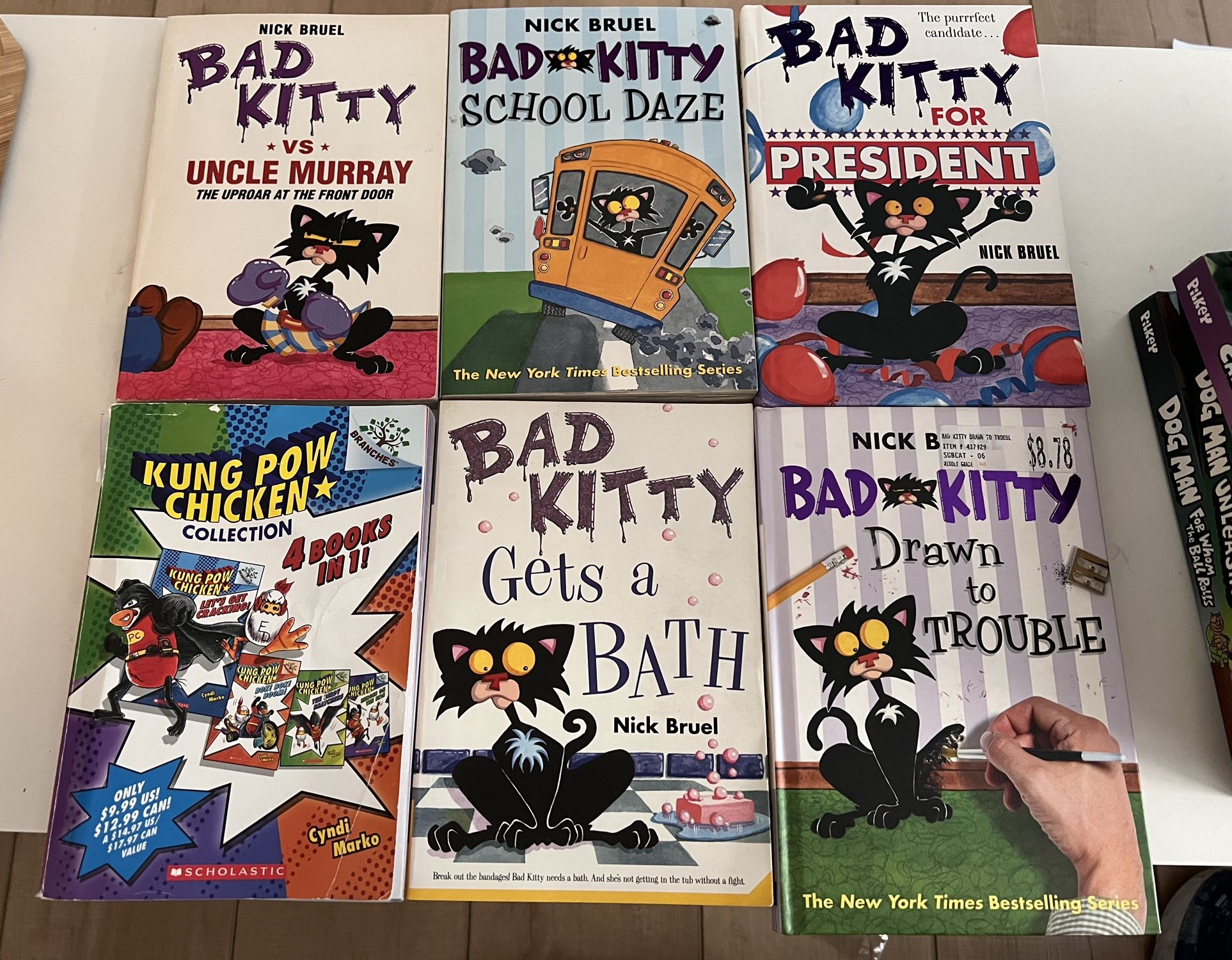 5 Bad Kitty books by Nick Bruel. Plus one Kung Pow Chicken collection that has 4 books in one.