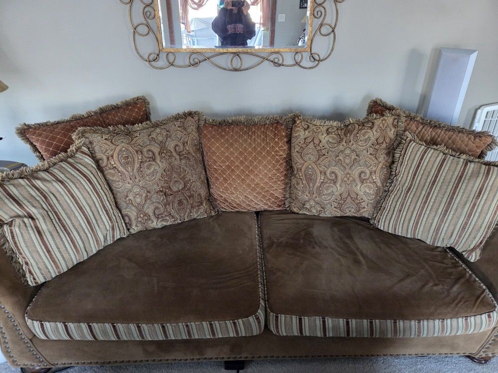 Brown and paisley couch, chair and 1/2 and ottoman for sell. It has reversible pillows. The brocade side had some small tears but the brown side is in good shape. It comes with 12 pillows. I am asking $400.