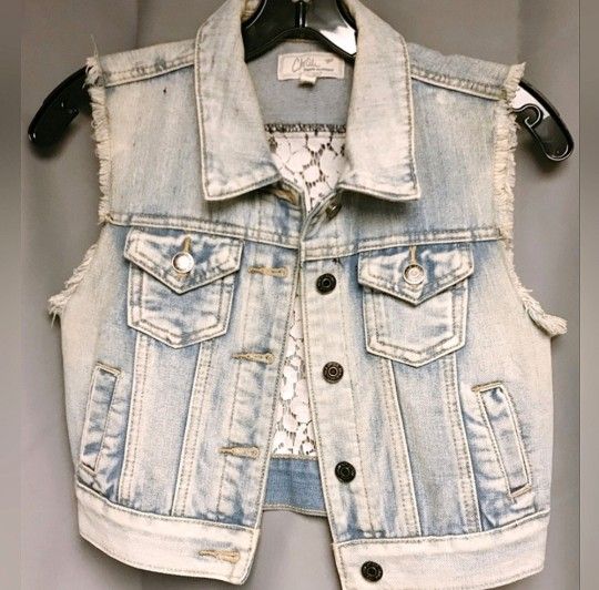 Vintage light wash denim vest with chest and side pockets. white lace back Sz S