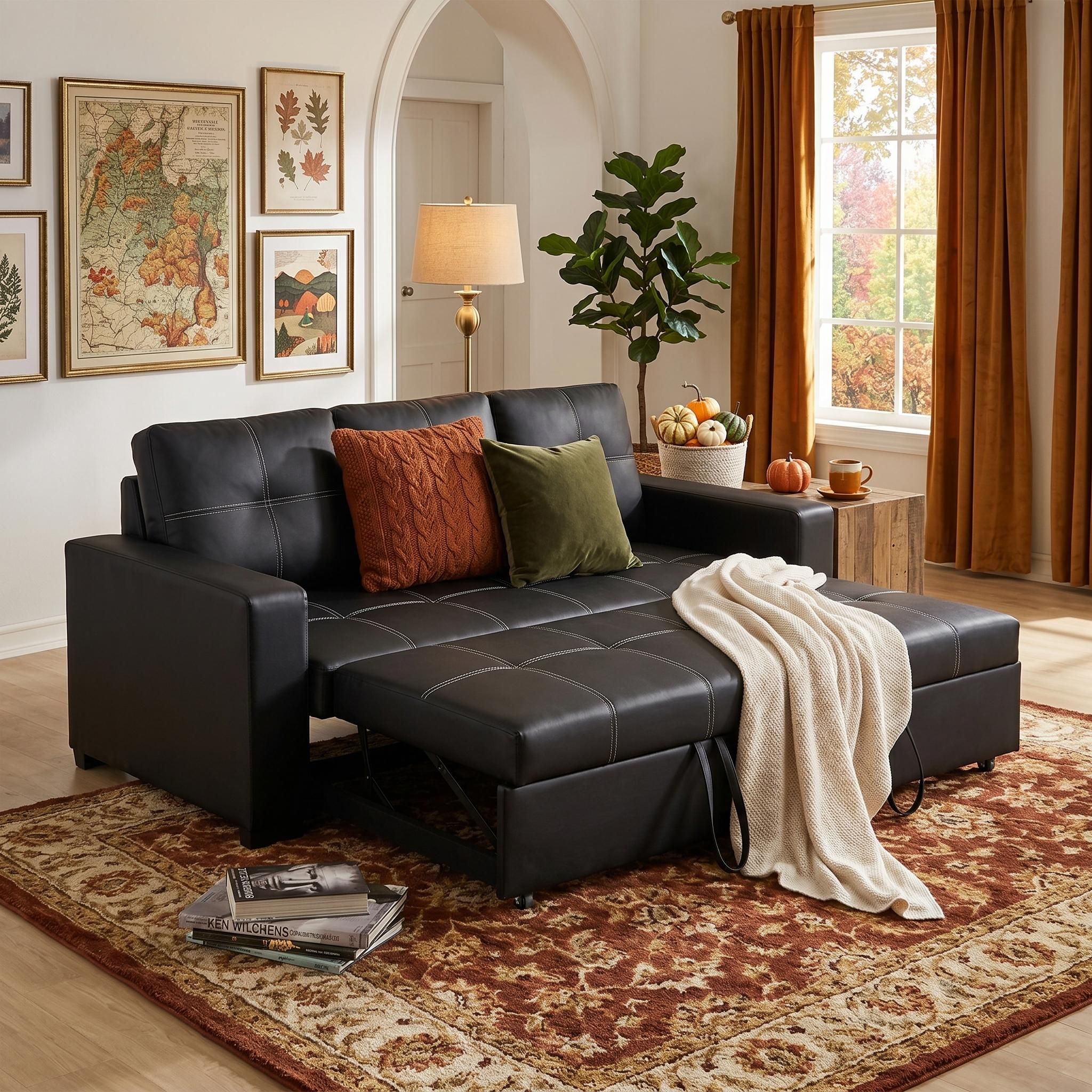 The Dalton sleeper sofa converts from a clean-lined three-seat sofa to a full pull-out bed in one motion. Tufted leather look upholstery, pocket coil seat cushions, and a solid pine frame give it the substance to work as everyday seating and the function to handle overnight guests without a second thought.