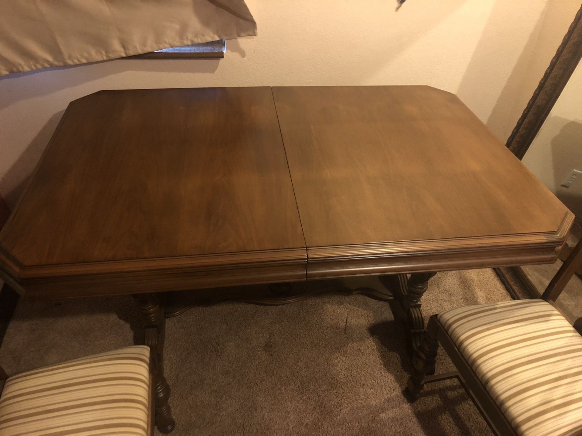 Grand table great shape... includes 6 chairs all good condition, 2 extension pieces, solid wood, reupholstered seats, antique 1920s