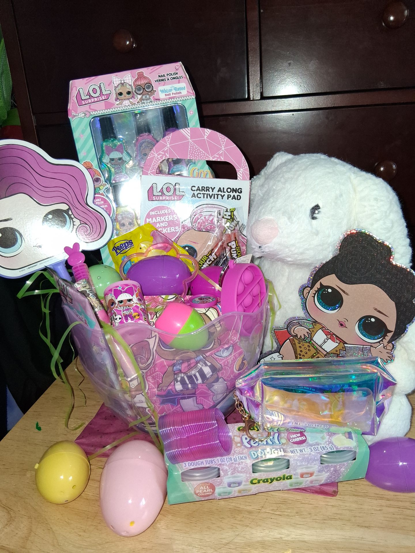 Bunny plushie, LOL activity pad ,LOL pen, LOL bracelet, LOL nail polish set , LOL mini coloring pages, LOL lip gloss, easter eggs filled with candy in every one, irradescent coin purse, pearlescent play doh. Chocolate bunny.