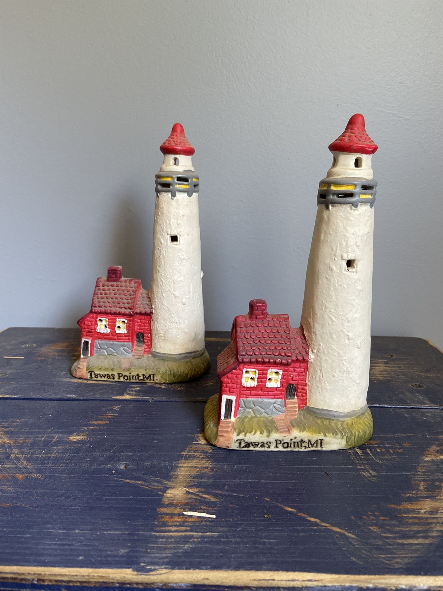 Ceramic lighthouse lamps. Uses nightlight bulb and cord.