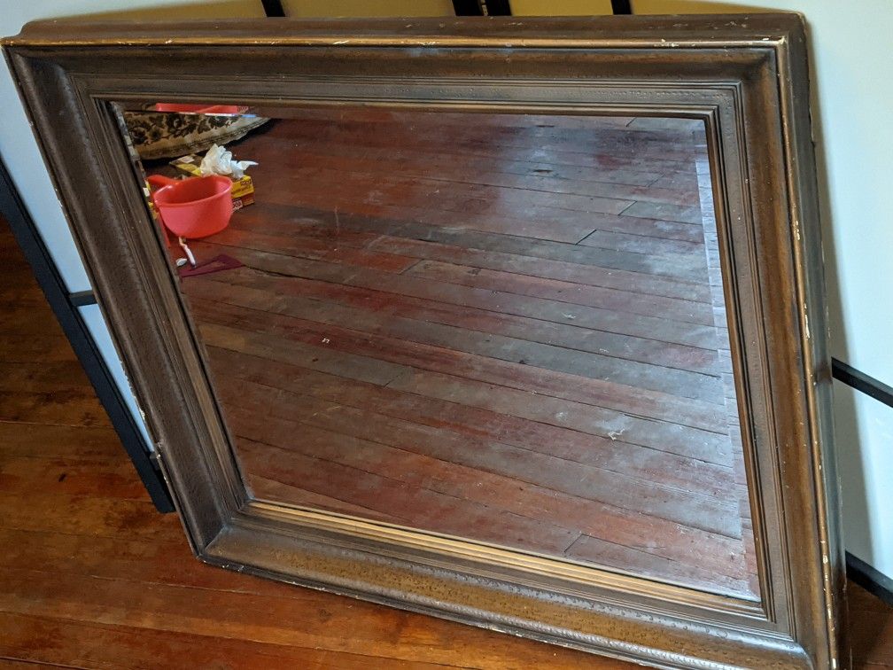 This large mirror opens up any room. It is framed by a solid wood frame. It is in good condition. The dimensions are: 33.5" (H) x 39" (L) x 2.5" (W).