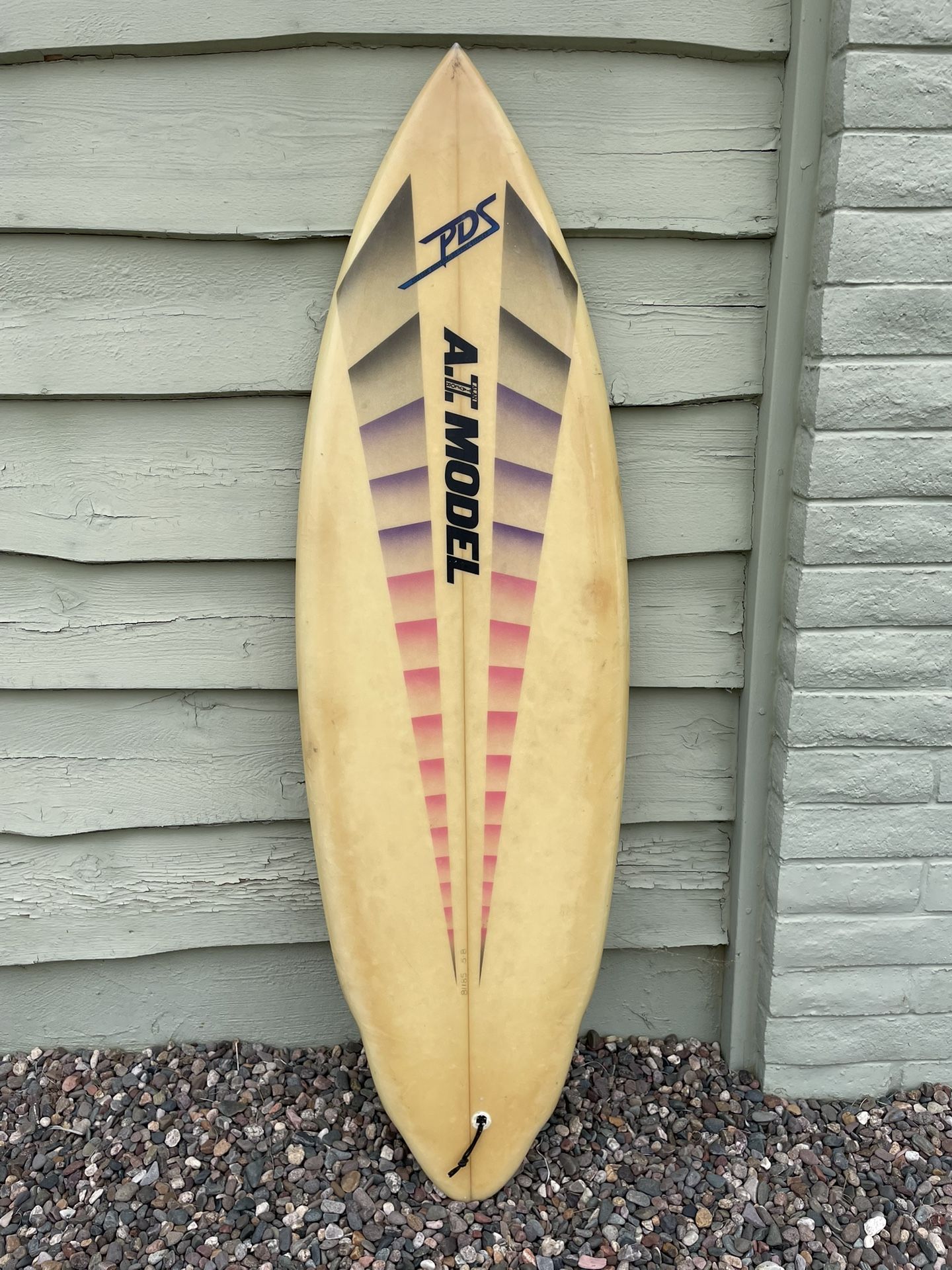 5’8” PDS (Tony Staples) double bump rounded pin, twin fin. Alan Taylor model. Comes with custom made fins that fit the box. Deck is solid, some very minor bumps and scratches.