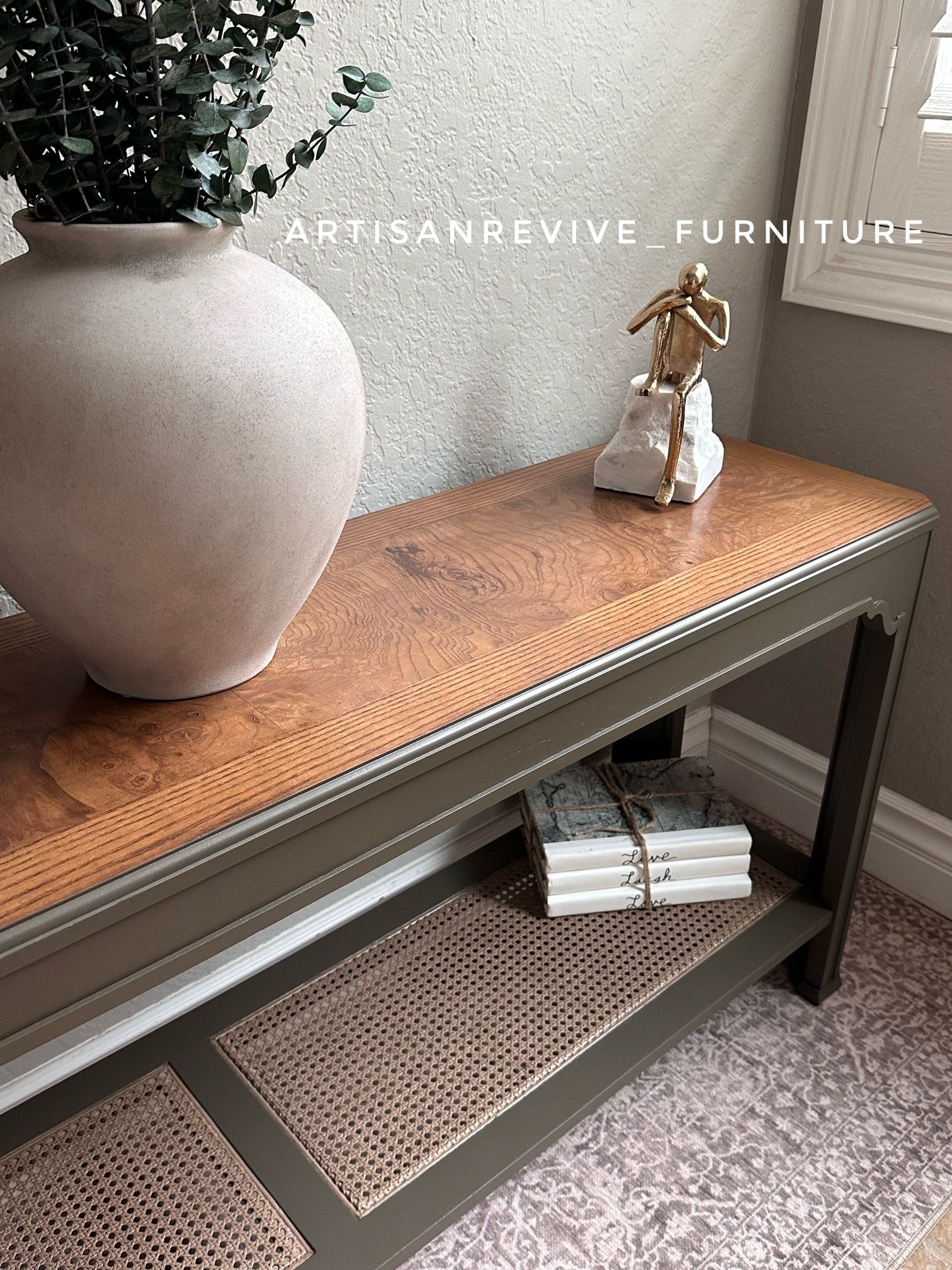 Beautifully crafted by Drexel Heritage, this 1970’s console table features Carpathian burled wood accents, a cane lower shelf in pristine condition, and a solid wood frame—built to last. Refinished in a dark greenish-grey premium furniture paint for a modern update, while the burlwood top has been sealed with a satin durable topcoat to highlight its natural beauty. Its slender profile makes it ideal for an entryway, hallway, or behind a sofa to add elegant vintage charm. Dimensions: Width: 57 1/2” Height: 25 1/4” Depth: 14” ✨ Price is firm and is based on value of furniture, premium materials used, quality of work and hours invested refinishing this one of a kind piece. You won’t find another one like it✨ Original maker’s mark intact 📍 Located in Chino Hills, CA Delivery available for an additional fee Feel free to message with any questions or inquiries Accessories pictured not included Cash or Zelle only, in person All sales final