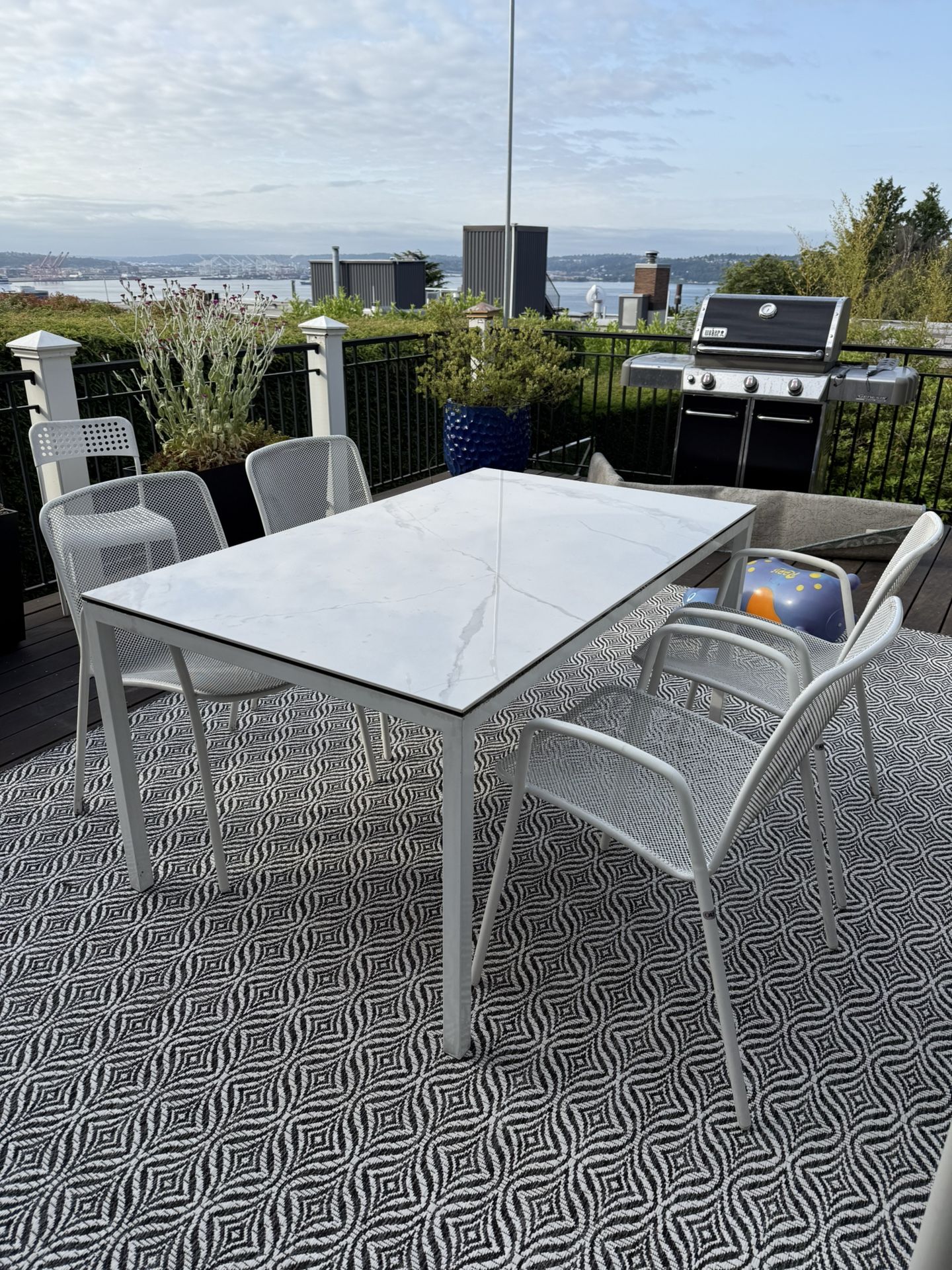 Excellent condition high end outdoor dining table. It’s a few years old but basically like new. Indestructible powder coated legs with a marble top that stays cool in the direct sunlight. Small rust stain on the tabletop that’s hard to spot. Paid over $1500. Measures 60 x 36. Chairs not included.