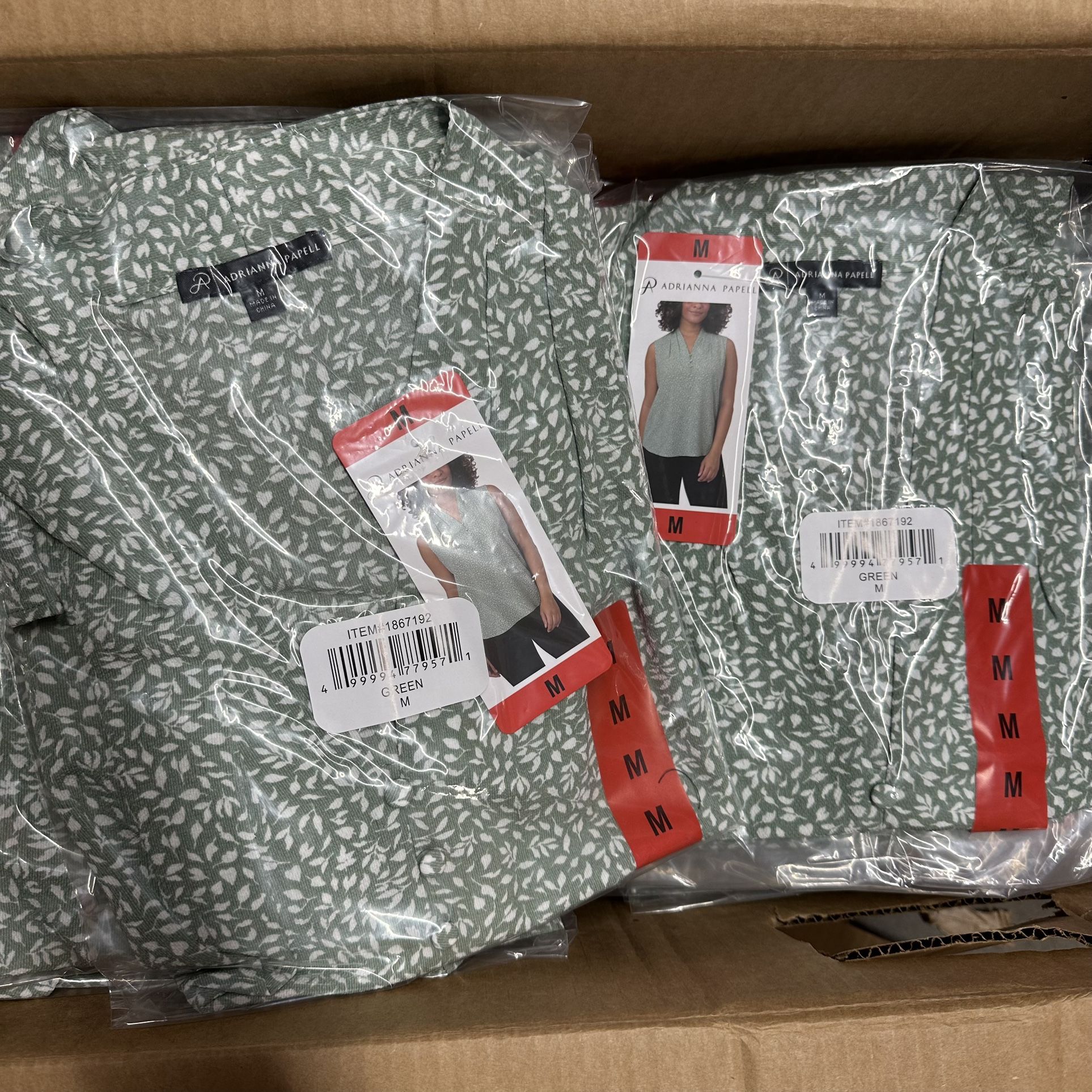New Adrianna Papell sleeveless tops in green printed pattern, size M. All pieces are brand new and sealed in original packaging. This listing is for size M Large stock on hand β suitable for resellers, boutiques, or bulk purchases Other sizes from XS to XXL are also available π Please check my other listings for additional styles, sizes, and brands π Menβs pants also available π Send the quantity you need and I will give you the best possible price Serious buyers welcome Pickup in Anaheim Delivery available for larger orders