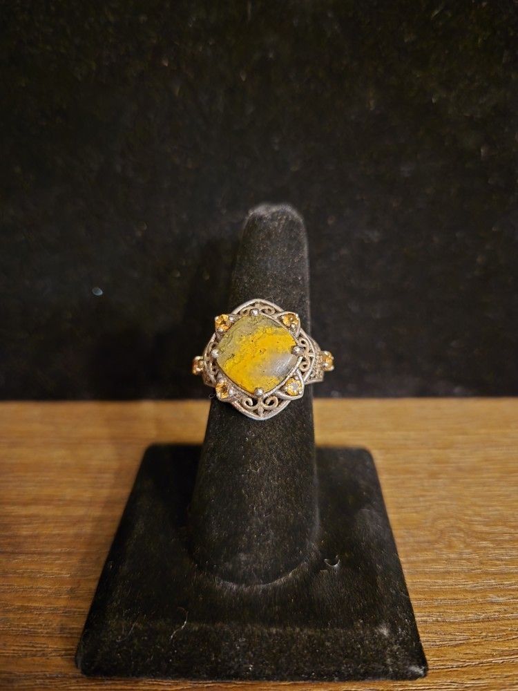 Beautiful Bumblebee Jasper Ring with 4 citrine gems on each corner, square shape, 2 citrine gems on each shoulder, sterling silver, sz- 7