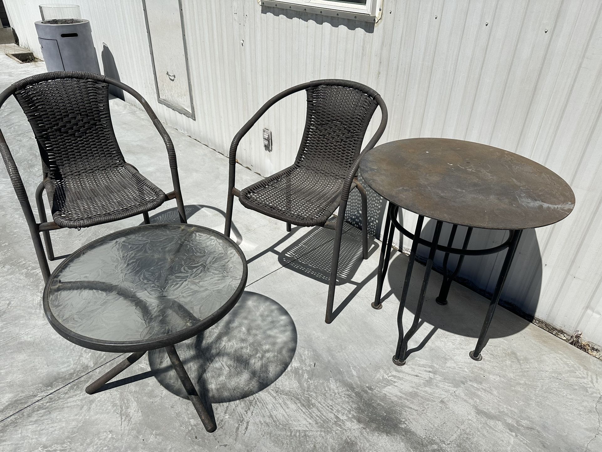 Chairs or glass end table $10 each Heavy Bistro table $35 All for $60 Click on my name to see my other items for sale. Open to offers. See pictures for condition. Located in South Palm Springs. From non smoking no pets home.