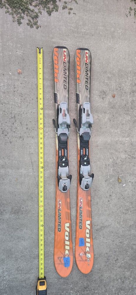 Kid Girl Boy Skis with Biddings Volkl Unlimited AC Jr 46" Long Length 1200mm Tail 93mm Waist 67mm Tip 107mm Good Condition San Jose 95121 area