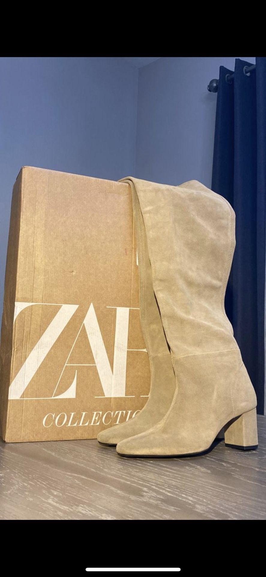 Color: beige Material: (real) leather Size: 8 Brand new never worn high knee Zara collection 20 women’s boots
