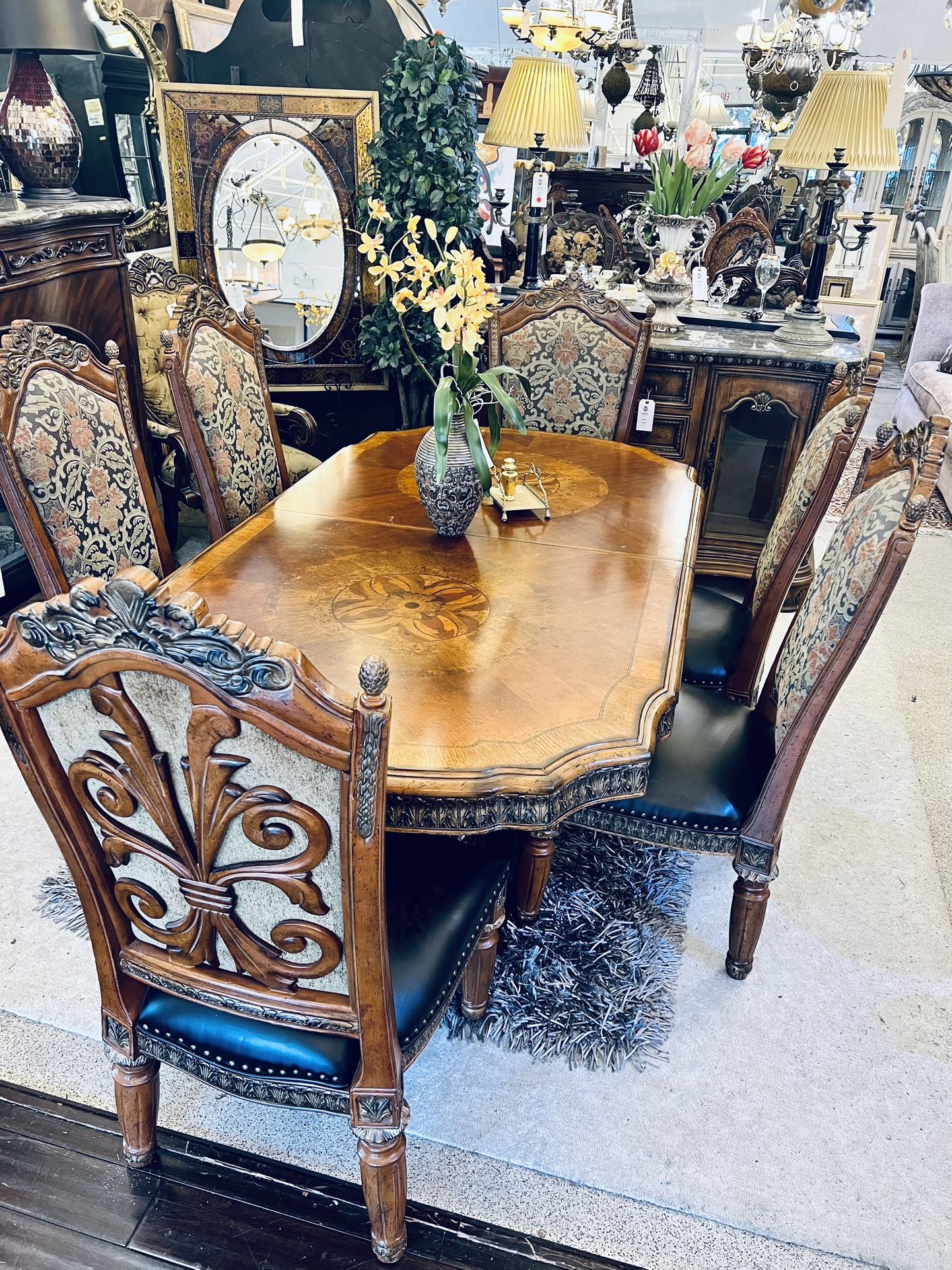 WE HAVE A LARGE INVENTORY IN HIGHEND FURNITURE, WOOD FURNITURE WITH ALL DIFFERENT COLLECTIONS. DINING ROOM SETS, BEDROOM SETS, LIVING ROOM SETS AND MANY OTHER BRANDS LIKE MAITLAND SMITH, VERSACE, BERNHARDT, HENREDON, BENNETTI AND ALSO ITEMS TO COMPLEMENT YOUR HOME DECOR, ACCESSORIES, PERFUM, JEWELRY, CHANDELIERS AND MORE. ASK FOR A VIDEO CALL WITH US!!! FREE DELIVERY UP TO 20 MILES!!! Table + 2 arm chairs + 4 side chairs The look and feel of Old World Spain have been beautifully captured in this grand collection, designed exclusively for the Michael Amini Original Furniture Designs. Beautifully crafted from Birch solids with Cherry, Pecan, and Elm Burl veneers, the distinctive marquetry and intricate embellishments compliment a classic chestnut finish. Uniquely twisted and shaped marble pilasters with carved wooden leaves wrapping around adorn some of the pieces Villa Valencia draws its inspirations from the city of Valencia, in Spain. The name itself comes from the Latin name of the city, Valentia, which means "strength," and "vigor." As it sits in the center of the Spanish Mediterranean coastline, Valencia overlooks the Gulf of Valencia, and is backed by mountains and rolling plains, creating a breathtaking environment. This area has seen numerous historical events, and as such, its character has continually developed. AICO Furniture designed by Michael Amini has been a TOP name brand since 1988 AICO, which stands for Amini Innovation Corp, features original furniture designs and is known for high quality and intricately designed home furnishing case goods and upholstery. They offer many collections that suit various tastes and styles. Ask for our FINANCE LAYAWAY program!!! 🦊 Additional we have Available FINANCING with Klarna, PayPal, ACIMA And more!!! Available at: Snooty Fox Consignments 840 E Oakland Park Blvd Oakland Park, FL 33334 754.206.20.77