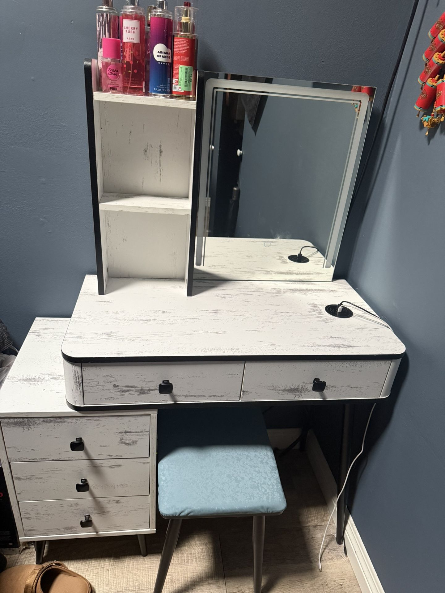 Great condition, sturdy, and perfect for makeup or a small workspace. Comes with vanity stool Pickup only. Perfumes not included lol