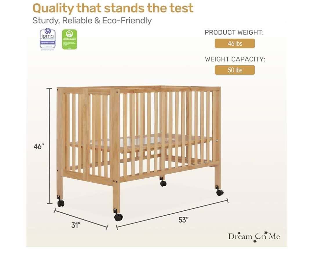 Full-Size Portable Baby Crib in Natural, GreenGuard Gold & JPMA, Patented Quick Fold System, Adjustable Mattress Support, Smooth Wheels, Compact Design, Safe Sleep Assurance $80
