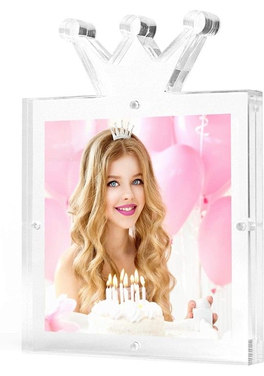 GORGEOUS PRINCESS ROOM DECOR - We created a magical princess themed floating picture frame so that you can proudly display your beautiful quinceanera crown or pageant photos and cheerleading victories, birthday girl wishes and more. This Crown picture frame is aesthetic room decor for teen girls THE BEST GIFT FOR GIRLS: Looking for an adorable baby shower favors or a little princess picture frame for her princess bedroom decor? Or maybe a stylish and unique frame to compliment your quinceanera or pageant crown? Tovlis Gift Box includes crystal clear picture frame with crown. Add a photo inside the frame or card for a personalized gift LONG LASTING QUALITY: This standing side table or desk acrylic photo frame 6x6 picture frame is UV resistant, shatterproof, with polished edges, designed to display your kids and teens memories for many years ARTWORK DISPLAY FOR KIDS ART: Twice as much space to showcase photo collage with frameless double sided magnetic frame STANDING DESK FRAME: Place it on a small floating shelf, in a play castle tent, next to princess crown light on a side desk CSKU-A9