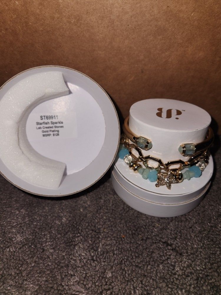 Name: Starfish sparkle Lab created stones Metal: Goal Plating Never worn, comes with box 3 bracelets
