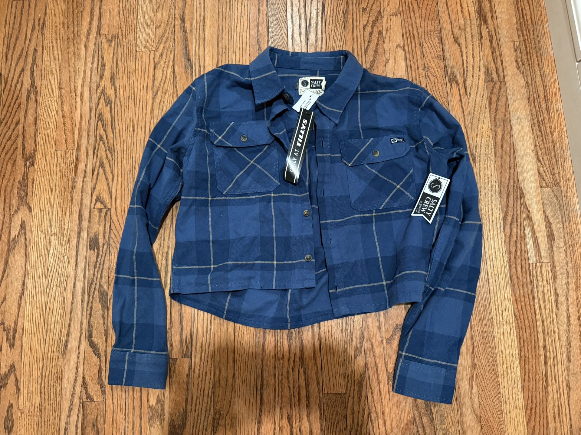 Tilly’s Salty Crew Small Blue plaid button-up long sleeve crop top
