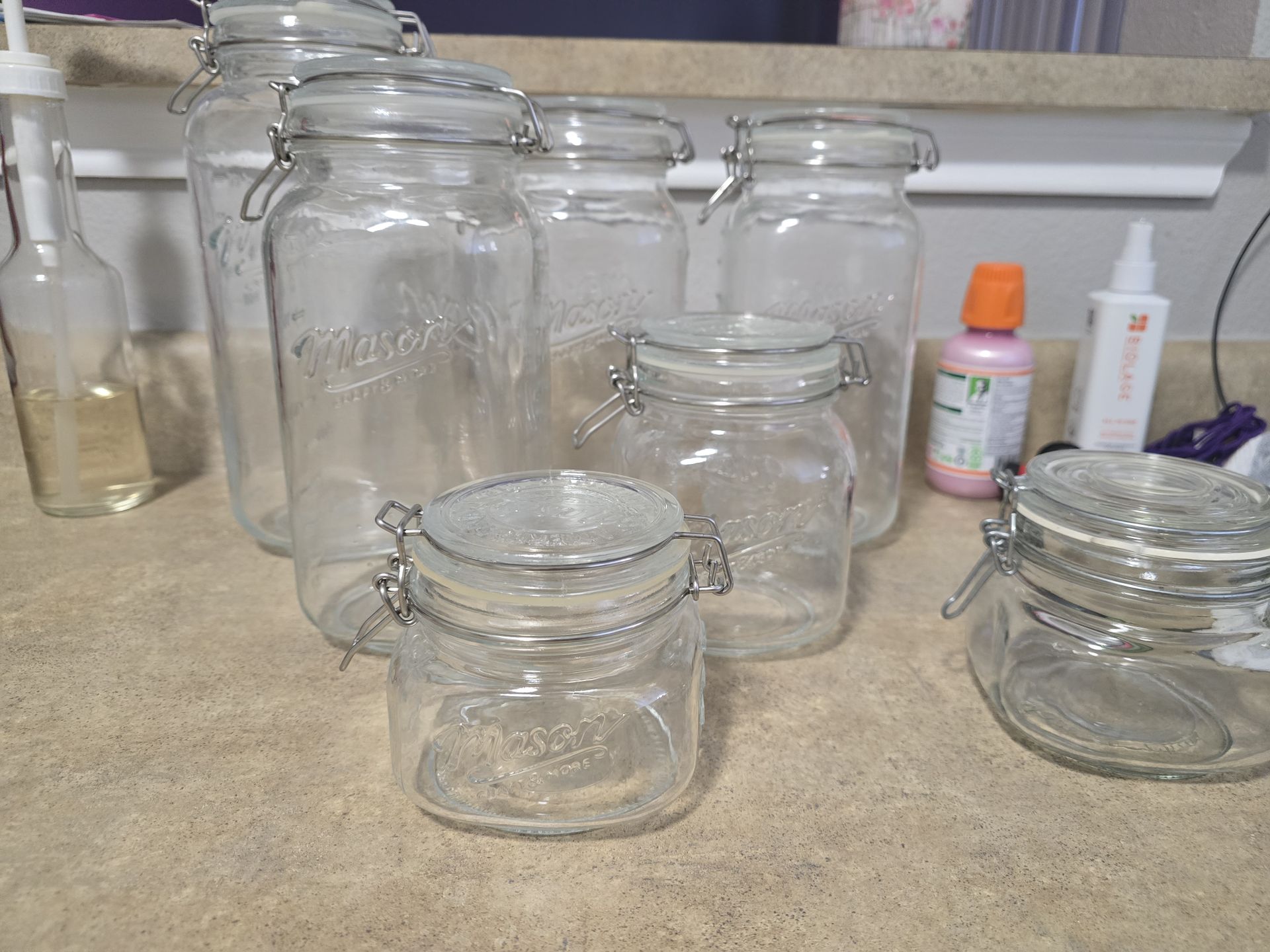 Six Mason Craft brand storage jars and one non-branded jar. Dishwasher safe. I've been using them as dry storage in my kitchen. Live Oak pickup only.