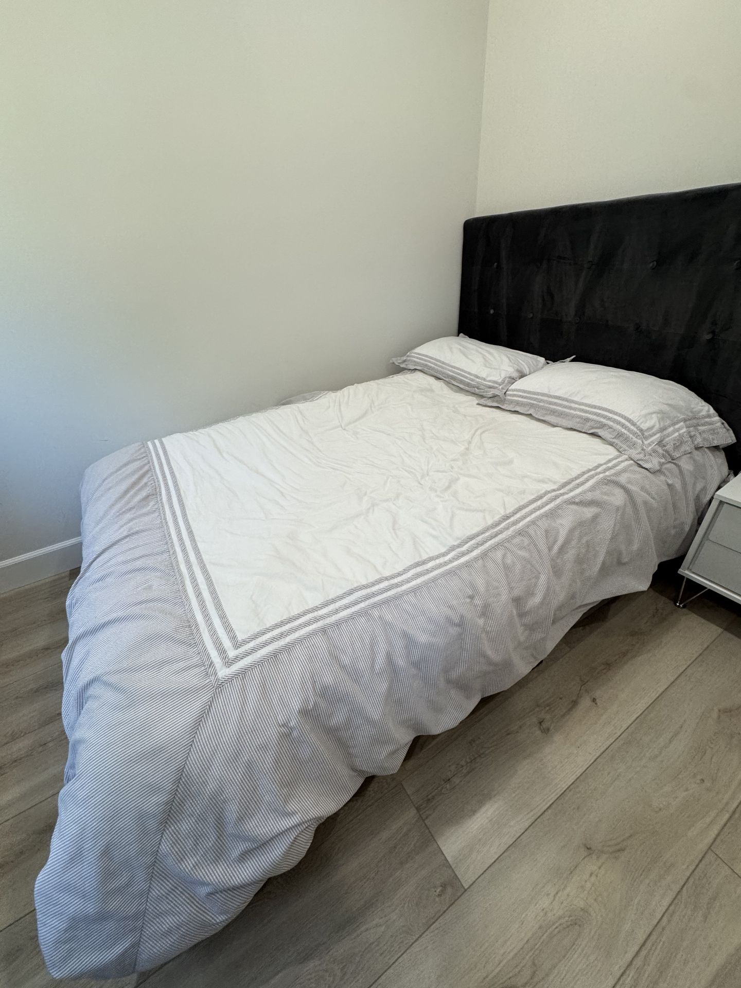 Excellent shape! Very easy to assemble just tighten 8 bolts. Will help load. Modern upholstered bed frame has gray fabric with a rectangular tufted headboard. It includes a sturdy wooden slat support system and matching upholstered side rails. The frame is currently disassembled for easy transport and includes all necessary hardware for reassembly. Sealy mattress! meet at local Starbucks in Calabasas 91302 ZIP Code